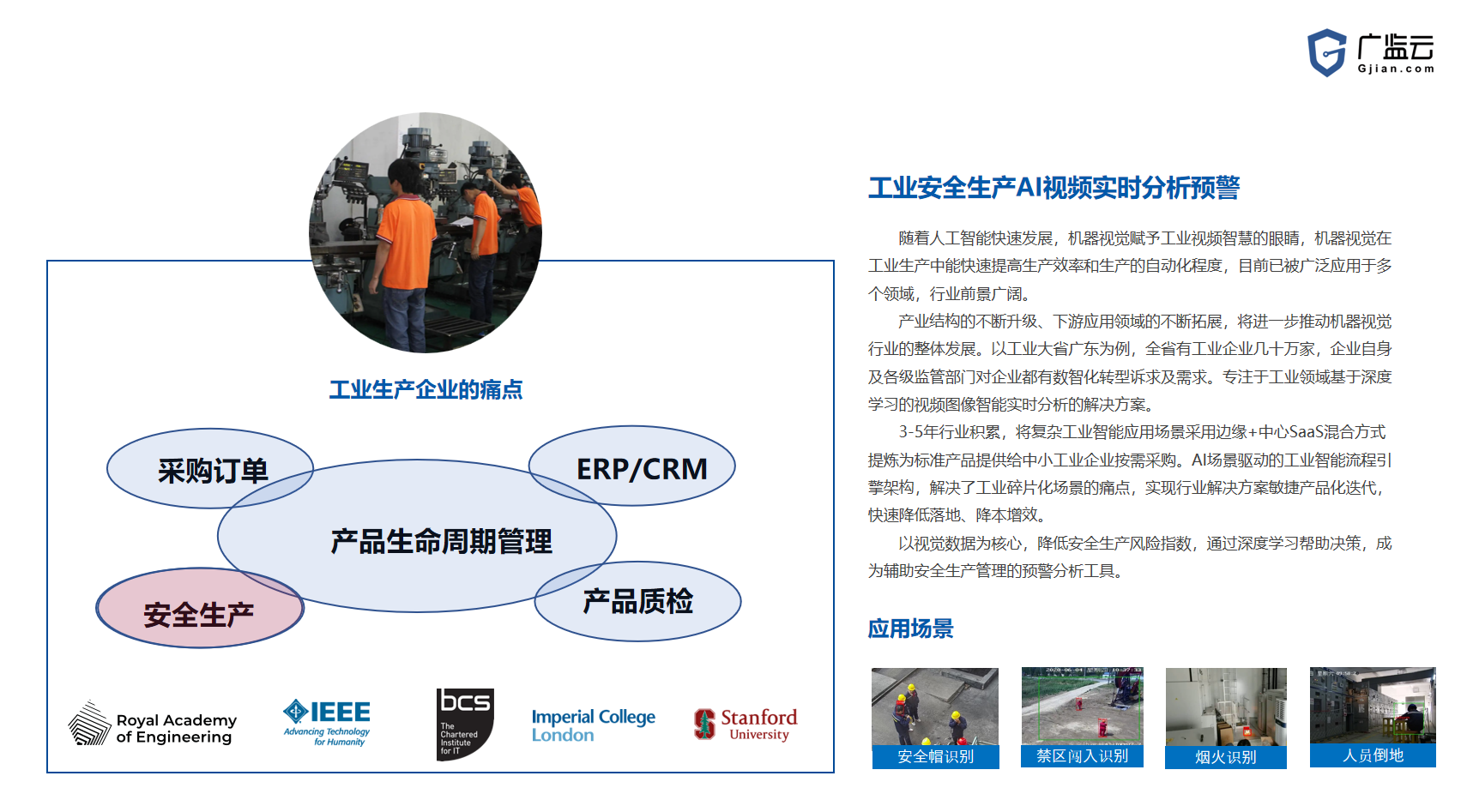 广监云AI视频分析一体化解决方案,具备丰富的图像算法,灵活的硬件匹配,全自主研发。降低企业监管成本,广监云分析方案包括着装识别,行为识别,物体识别,环境检测,状态检测等功能,满足各个场景应用需求。